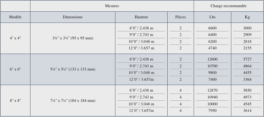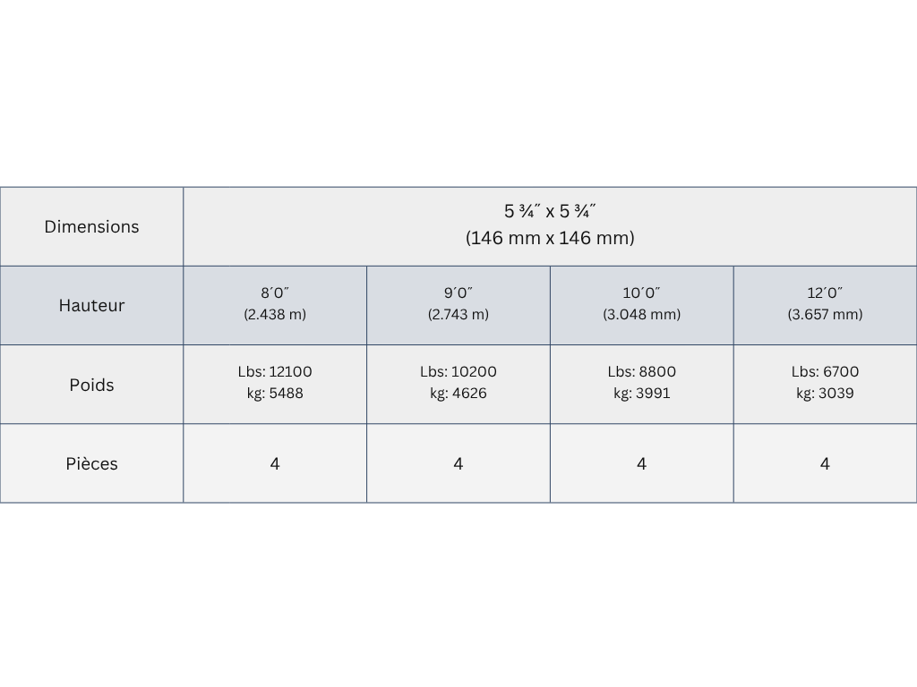 Nos colonnes en aluminium de dimension 4×4, 6×6 et 8×8 sont offertes en hauteur de 8 pieds, 10 pieds et 12 pieds. Le format dépend de l’usage souhaité: les colonnes 4×4 conviennent aux petits balcons, tandis que les 6×6 ou 8×8 s’adaptent mieux aux structures plus imposantes comme une galerie couverte.