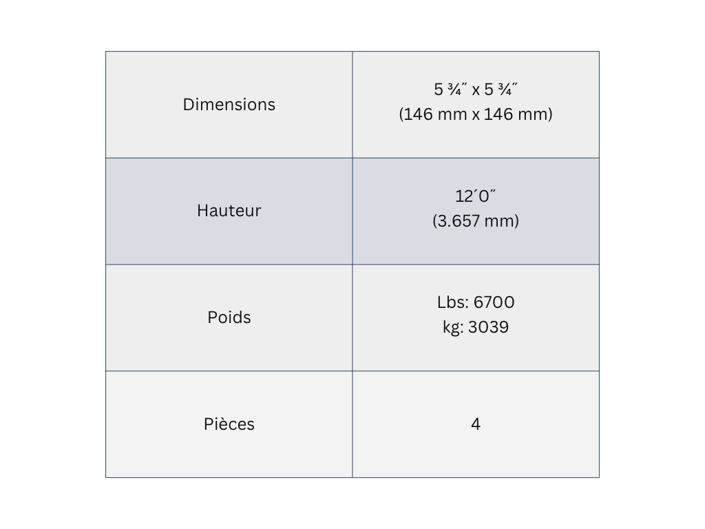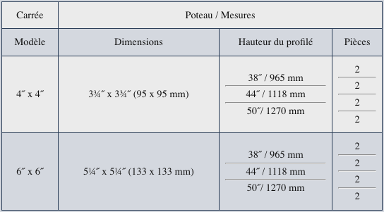 Disponibles en modèles 4×4, 6×6 et 8×8 ainsi qu’en hauteurs de 8, 9, 10, 11, 12 pieds et plus pour certains modèles. Nos poteaux s’installent facilement et certains ont des adaptateurs inclus, que ce soit pour une clôture en aluminium, une galerie ou un projet sur mesure, nos poteaux en aluminium se déclinent en différents modèles et dimensions, s’adaptant facilement à toutes les configurations.